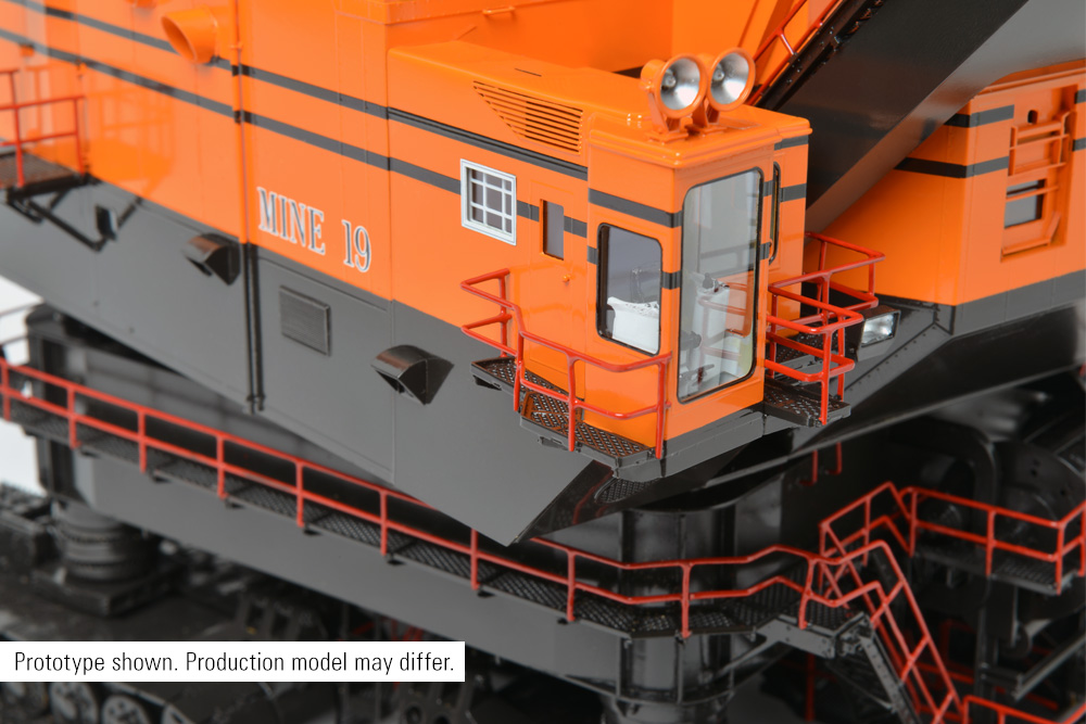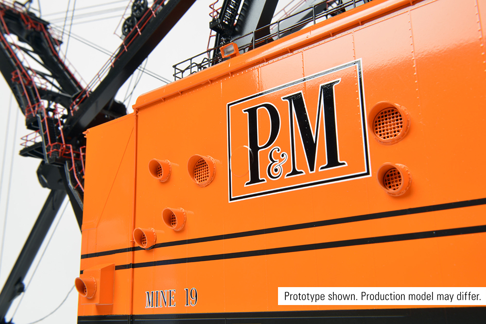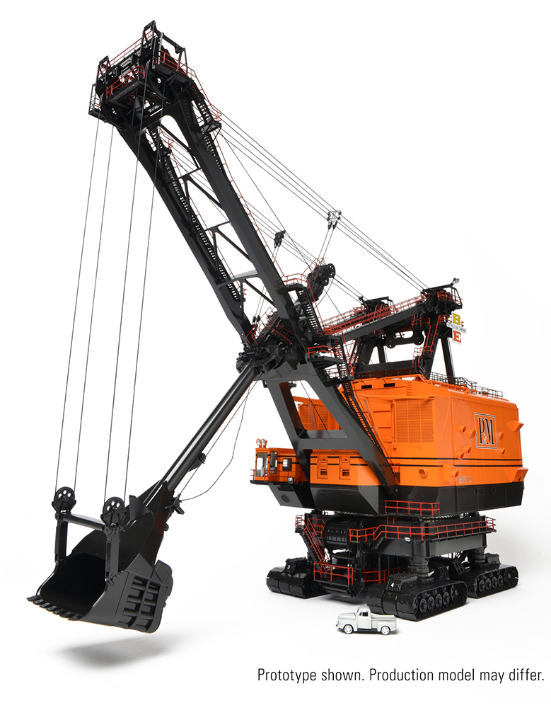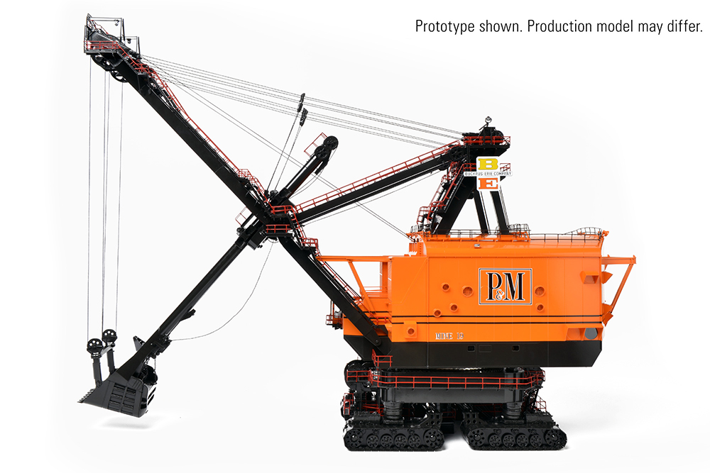 Incredible detailing from the undercarriage to the top of the boom brings this historic monument to life as the centerpiece of any collection. The accurately replicated dipper features a functional dipper door and, with working crowd, matches the motions of the machine during it’s working life as well as providing multiple display positions. Era appropriate Bucyrus-Erie and Pittsburg & Midway paint and markings set this model apart in a class of its own. In a true test of quality, hours can be spent admiring the precision work in this one-time-only recreation of the only Bucyrus-Erie 1850-B ever to be made.