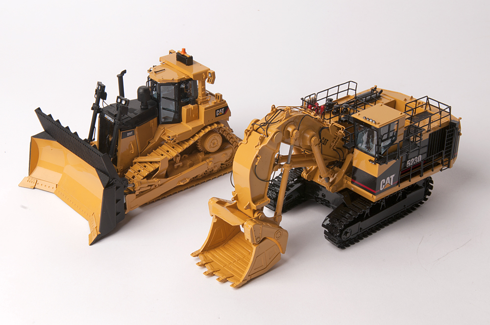 So our customers can get a better sense of how large our upcoming Cat 5230 Mass Excavator and Front Shovel brass model is, we present this comparison. Below you can see the 1:87 scale 5230 Front Shovel beside our D9T in 1:48 scale brass.