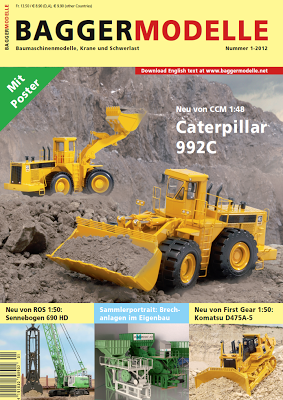 CCM’s upcoming Caterpillar 992C in 1:48 scale die-cast appears – in both versions – on the cover of the January issue of Baggermodelle.
