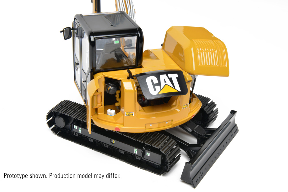 The engine is visible through the three opening engine access doors along the side and rear of the machine and provide a detailed look at the Cat C3.3B DI turbo engine. Individually linked, free-rolling tracks as well as functional track tensioners and modelled bogies complete the accurately scaled undercarriage and match the motions of the 1:1 machine.