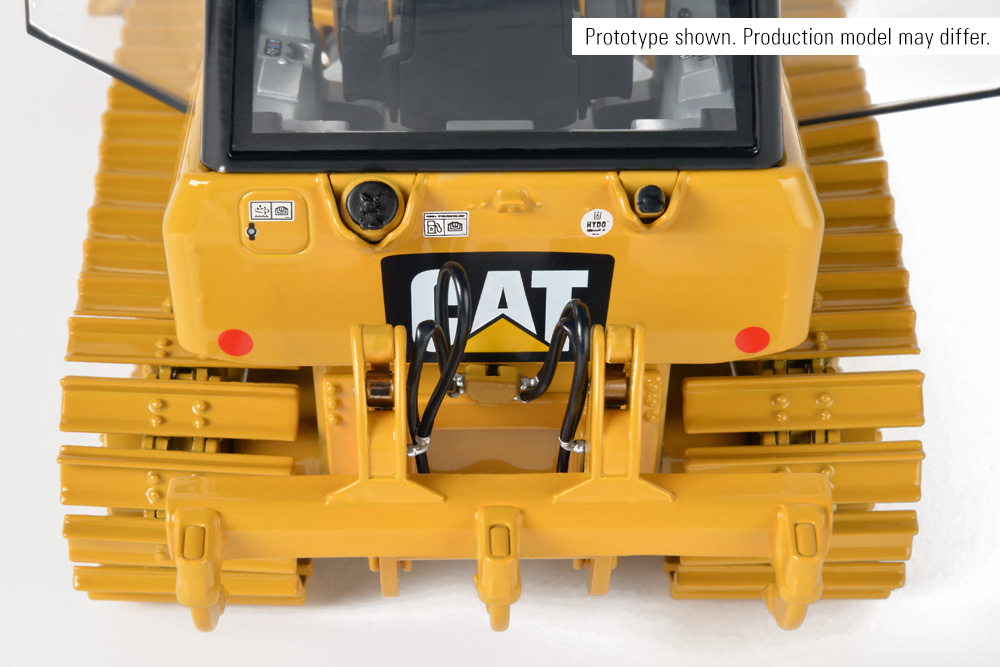 The cab features dual opening doors, joystick controls, foot pedals, and precise instrumentation. Functional track tensioners along with individually linked, free-rolling track pads make up the undercarriage, while the Cat C4.4 ACERT™ engine, complete with multiple maintenance points, is visible through the opening engine access door. The fully articulated blade and 3-shank ripper match the motions of the 1:1 machine and provide multiple display positions for the model. Paint and markings have been approved by Caterpillar for accuracy.