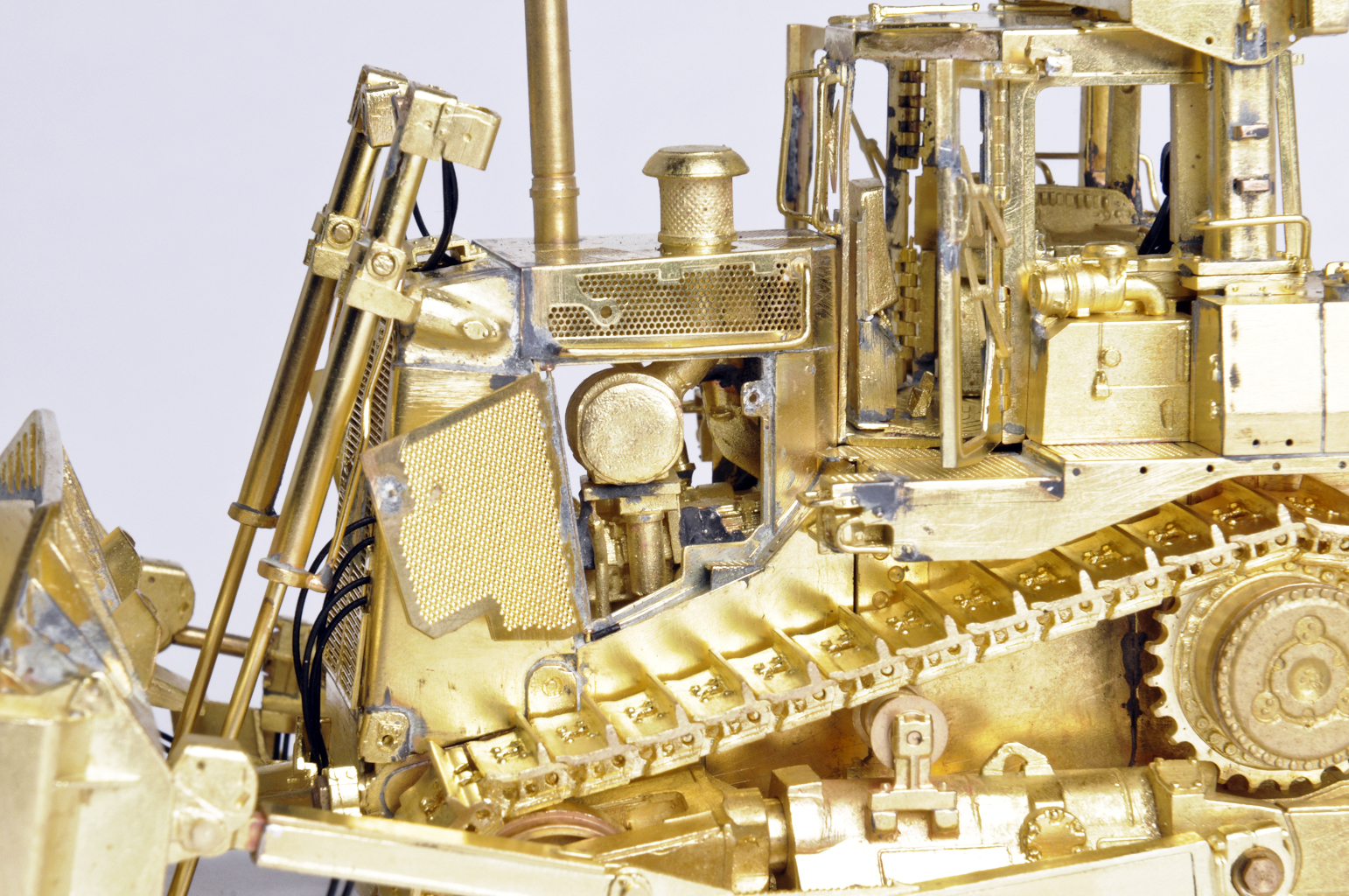 Features of this D9T include: a positionable single-shank ripper, U blade with spill guard, individually-linked, free-rolling tracks, working track tensioners, fully-functioning bogeys, opening engine doors, a detailed operators cab with functional doors, lights, grab handles, and hydraulic lines.