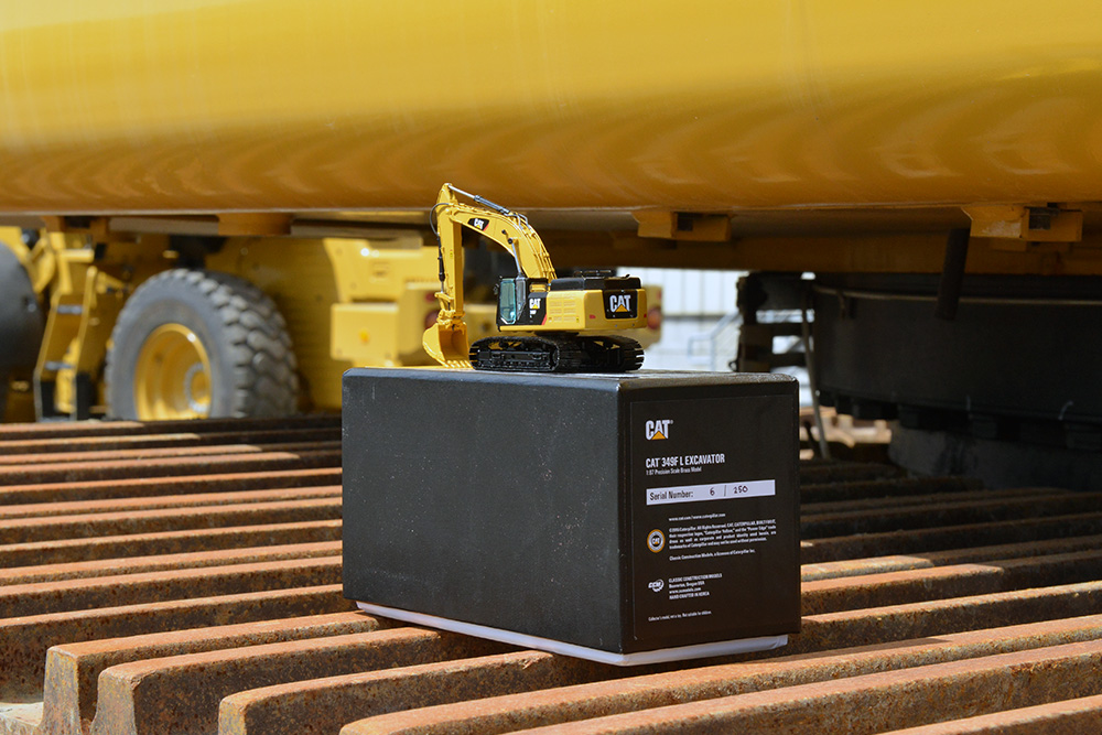 We recently had the opportunity to stop by and see our friends at Peterson Cat in Portland, OR and brought a few models along with us. While on site, we were able to go out in the yard and see a 349F L. We couldn’t help ourselves, we had to take advantage of this opportunity and take some pictures… Check out our 349F L in 1:87 scale resting on the track of their 1:1 machine!