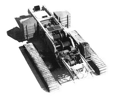 The carbody connected the rotating bed to the crawlers. The steel rotating module mounted to the single-piece carbody via a large (9’8”) diameter turntable bearing. When assembled, the crawlers were 30’9” long with reinforced steel frames, the treads were 4 feet wide, and there were low-maintenance intermediate rollers. Each of the two crawlers was powered independently by two variable-displacement hydraulic motors and a planetary-and-spur gear reduction that drove the chain to the crawler. The crawlers had the additional ability to counter-rotate which allowed superior mobility in confined areas.