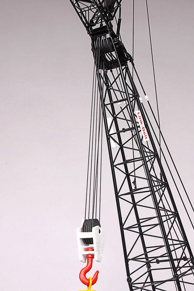 This scale model was individually hand-built and painted in red and white to the factory-authorized specifications of Link-Belt. The 1:48 scale allowed the inclusion of a host of fine details and features, such as working drums, opening doors, 360-degree rotating house, rubber tires, functional load block, and authentic markings.