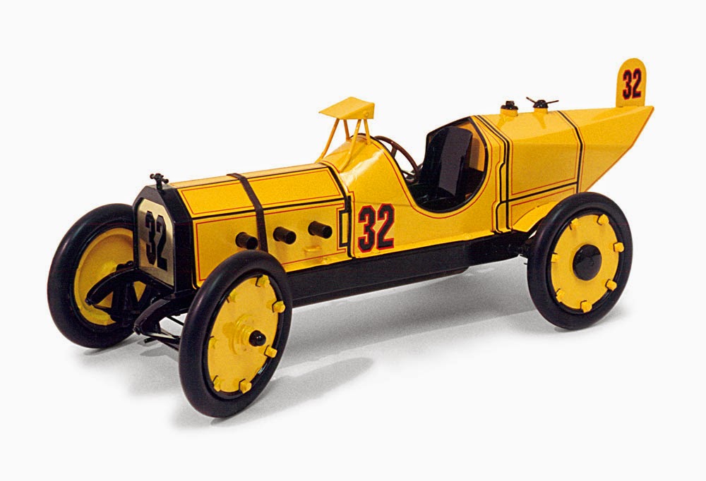 In 1996, after a long discussion as to why a toy version has never been built of it, we decided to create our own “tin toy” version of the Marmon Wasp – the car that won the first Indianapolis 500 in 1911. Driven by company engineer Ray Harroun the Wasp finished the race in 6 hours, 42 minutes and 8 seconds after using almost as much oil as gasoline. Built by the Marmon Motor Car Company, it was powered by a six-cylinder engine constructed from three stock Marmon two-cylinder blocks. The Wasp also featured the black and yellow paint scheme that earned its name and a rear-view mirror, which was new to automobiles at the time and designed by Harroun to eliminate the need for a mechanic to ride in the car with him. In 1961 the car got an anniversary lap at the 50th Indy 500 – driven by a very proud Harroun himself.