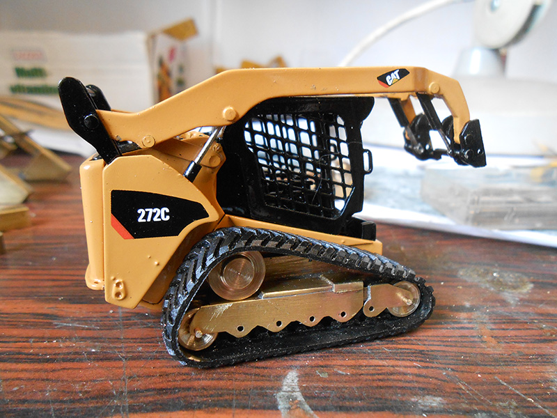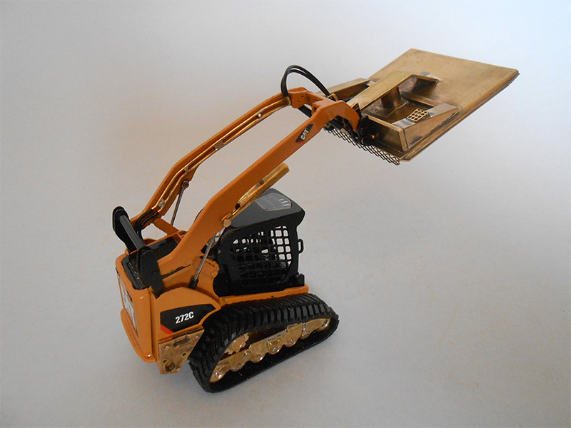 For this project I started with a 272C Skid Steer Loader because the body of the machine is nearly identical to the 289C. Using a 1:50 scale spec sheet, I cut out a carton mold of the undercarriage and from that crafted a brass plate which allows for the entire undercarriage to be painted prior to assembly. After some trial and error, each new part is assembled and tested for fit and functionality.