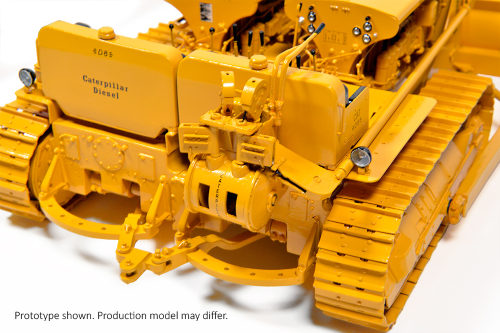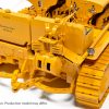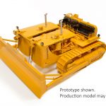 Attached to the front of this machine and controlled by a cable-driven system on each tractor is an 8.2″ wide blade. The undercarriage of the model consists of individually linked, free-rolling tracks wrapped around drive sprockets and idlers with functional track tensioners.