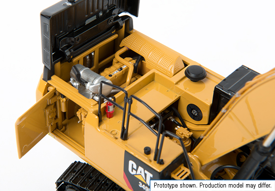 The CCM 1:48 scale die-cast model of the 349E L Excavator has a mass excavator boom, stick and bucket. The model also features a functioning variable gauge long undercarriage system, allowing the track assemblies to be posed at full width or narrowed for transport. All aspects of the 349E L are modeled to the usual level of CCM’s exacting detail, including hydraulic lines, opening cab, and access to full engine compartment.