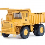 As is true with all our models, our goal was to capture as much detail as possible to make the model a true reflection of the machine. From the perforated grill and clear molded headlights to the lip of the dump bed, we’re proud to say it breaks the toy quality stereotype for Caterpillar die cast models. Lifting the dump bed exposes the chromed piston rods on the three stage lift cylinders while allowing a view of the accurately modeled drive shafts, transmission, rear axle, air and hydraulic tanks. Movable steering with operating cylinders, hinged “rock busters”, flexible rubber mud flaps and silver painted exhaust all add to the models realism. Almost hidden inside the model is the highly detailed Caterpillar diesel that powered the truck. The model is finished with appropriate paint and markings for its time.