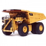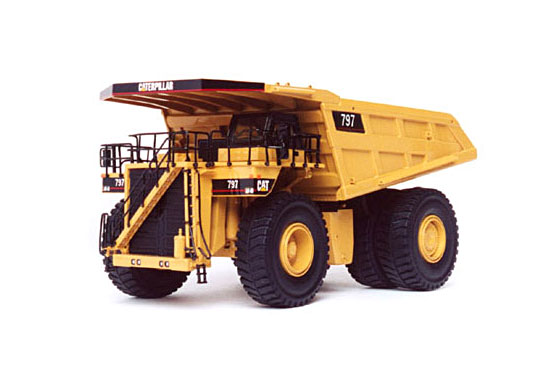 With an operating weight of 1,314,000 pounds and a payload capacity of 360 tons, the Caterpillar 797 Mining Truck is the largest Mining Truck in the world. The 797 is powered by a 24 cylinder diesel engine that produces an amazing 3,400 gross horsepower. The truck measures 23 feet from the road to the top of truck bed and almost 50 feet in length. Eight onboard computers monitor, among other things, oil pressure, transmission torque, engine performance and tire temperature.