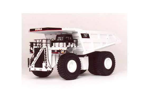 Caterpillar supplied CCM access to the Caterpillar proving grounds in Tucson, Arizona to ensure every possible detail was included on the 797 model. All of the nuts and bolts are visible on this model and all of the measurements are accurate. Each is constructed entirely of investment cast and etched brass parts and is built to exact 1:87 scale. Every model is hand-assembled and hand-painted in authentic colors and markings. The 797 model is museum quality and demonstrates the highest levels of the model building art. Each features a detailed cab, twin body hoists to raise and lower the dump box and authentic rubber tires.