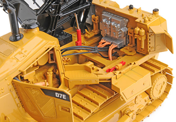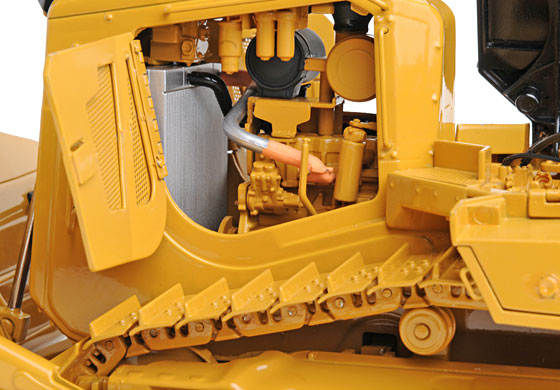 Everything expected from CCM for detail is readily apparent when you first look at the D7E model. This includes individually linked tracks with tensioners, movable blade, a complete cab interior and accurate markings. A closer look reveals opening engine covers with a fully detailed engine and access panels which when opened allow the cab to tilt and show the entire internal drive train on the dozer. With this standard of die-cast model detail, this will surely become another in the long line of “truly collectible” models from CCM.