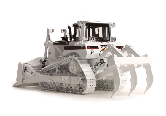 Equipped with a positionable three-shank ripper and semi-u blade, measures nearly 13” long, 5 ½” tall and more than 6” wide. Details that customers have come to expect from CCM, such as individually-linked, free-rolling tracks, working track tensioners, a detailed operators cab as well as lights, grab handles and hydraulic lines are all included. Engine doors open to show a fully detailed engine, cab doors with locks open and skid plates hinge open to reveal the under side details of the engine and drive train.