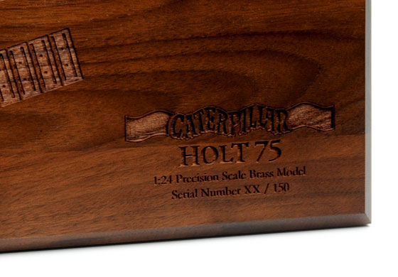 Each base is individually engraved with track imprints and tiller wheel marks that indicate the path of the displayed model. Included on the base are authentic Caterpillar and CCM marks along with the serial number of your model.