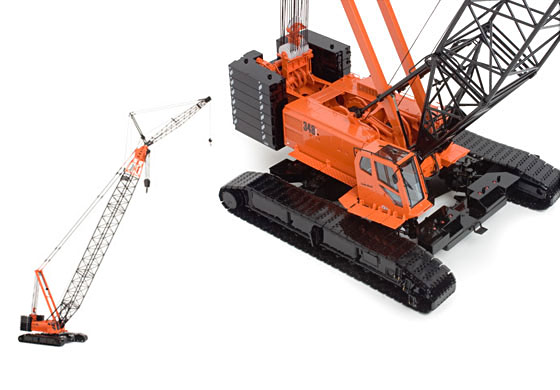 Created in a strictly limited, one time edition, each of these cranes is hand crafted from hundreds of individually investment cast, etched and formed brass components. The design of Link-Belt’s newest 300 ton crane has been replicated with the precise details that have made CCM world renowned. The 348 H5 model crane is equipped with 110’ of scale boom, a fully detailed engine, free rolling tracks, working track tensioners, a 4-way positionable cab and a working access panel that reveals a storage compartment and hydraulic filter. Folding steps on the track frames and a working safety latch on the hook are just some of the other incredible details to be found on this model. A total of 45 models were painted, with permission, in Dielco Crane orange body and black boom, crawler and counterweight color scheme with correct Dielco logo’s and markings.