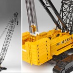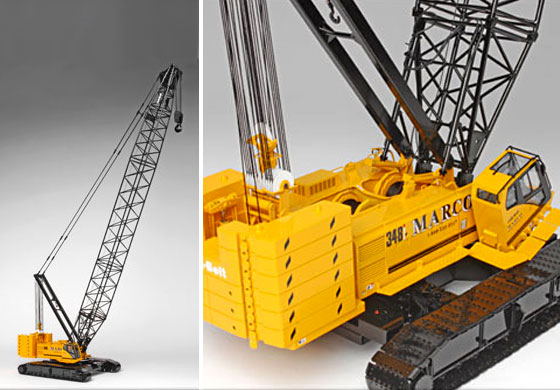 Created in a strictly limited, one time edition, each of these cranes is hand crafted from hundreds of individually investment cast, etched and formed brass components. The design of Link-Belt’s newest 300 ton crane has been replicated with the precise details that have made CCM world renowned. The 348 H5 model crane is equipped with 110’ of scale boom, a fully detailed engine, free rolling tracks, working track tensioners, a 4-way positionable cab and a working access panel that reveals a storage compartment and hydraulic filter. Folding steps on the track frames and a working safety latch on the hook are just some of the other incredible details to be found on this model. A total of 50 models were painted, with permission, in Marco Crane Care’s yellow body and black boom color scheme with correct Marco logo’s and markings. Each Marco crane will came standard with 300’ of boom.