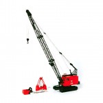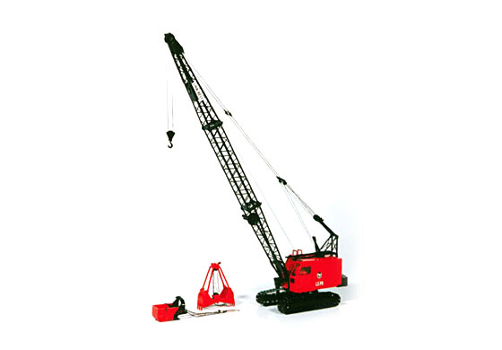 Our crane version of the LS98 includes Individually linked and movable tracks, 360 degree cab rotation, three working drums, sliding cab door, catwalk, and ladder to access top of house – all in brass and all at exact 1:48 scale. Other noted features include 60 feet of boom (15” in scale) with a revolving fairlead and a “Tag-Master” installed. Each model includes a load block, a functioning clamshell bucket and a dragline bucket so that the model can be configured as desired. The model is painted and marked in authentic Link-Belt colors and graphics.