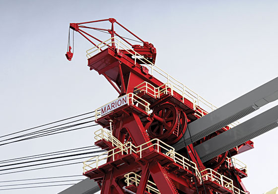 At the time of its creation in 1965 for the Southwestern Illinois Coal Corporation, the Marion 6360 was the world’s largest mobile land machine; with ballast it weighed 28 million pounds. Working around the clock, seven days a week, it helped deliver approximately 150 railroad carloads of coal a day, moving overburden 270 tons at a pass. The two hoist drums, containing more than a mile of wire rope, were driven by eight 1,000 hp electric motors, the largest ever used in an excavator. Four 3 1/2-inch wire ropes hoisted the dipper through a two part hitch. Four motor generator sets converted 14,000 volt AC power to direct current for twenty main-drive motors capable of 30,000 horsepower output. The shovel propelled itself at 1/4 mph. Each crawler was 45 feet long and 16 feet high. Each crawler shoe measured ten feet across and tipped the scales at 3 1/2 tons. The 180-cubic-yard dipper measured 24 feet from teeth to door.