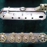 The first prototype models currently have completed truck assemblies, dipper & bucket, swing gear, and the bottom of the housing, with hundreds more pieces of cast, etched, and machined brass to be assembled before the model is complete. The model will be finished with period correct colors, as well as both Bucyrus-Erie and Pittsburg & Midway markings.