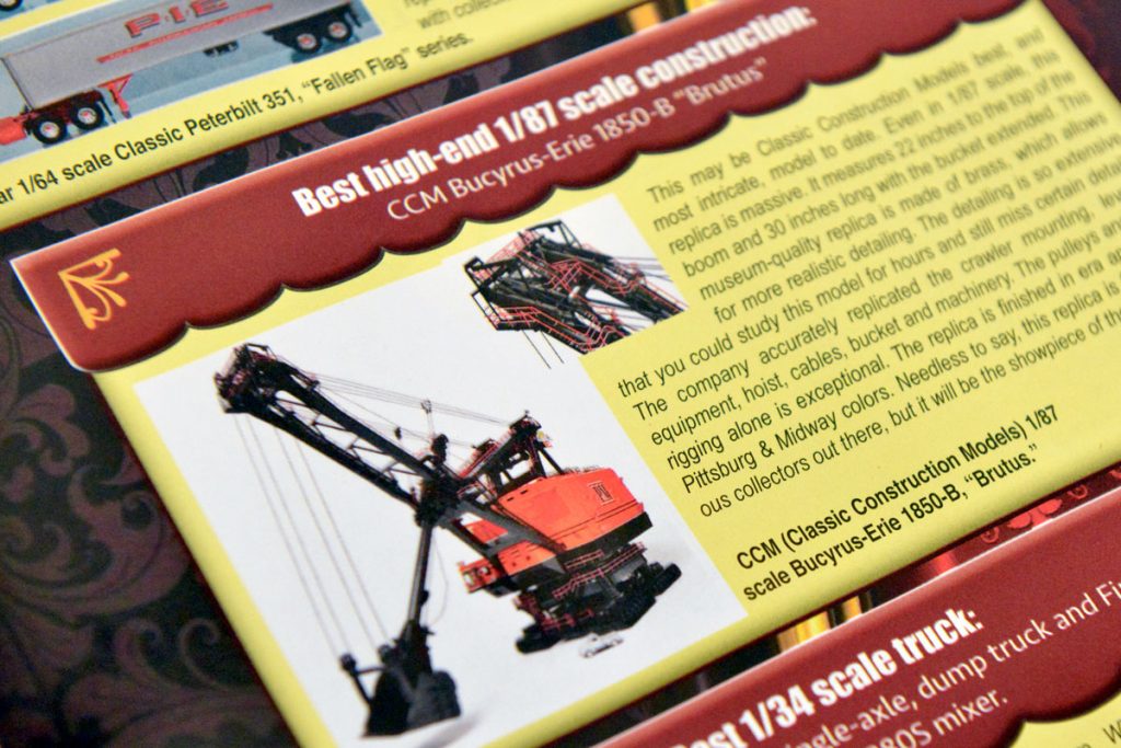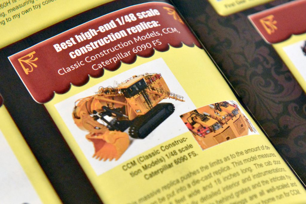 Every year, Toy Trucker & Contractor presents their ‘Best of’ scale model year-in-review, and we are proud to announce that this year we were named to this list not once, but twice! Both our Bucyrus-Erie 1850-B ‘Brutus’ model from brass in 1:87 scale, as well as our 1:48 scale die-cast Cat® 6090FS, were selected for this prestigious award. Our Bucyrus-Erie 1850-B was not only selected as the ‘Best High-End 1/87 Scale Construction Model’ of 2018, but was also honored with premier placement on the magazine’s cover!